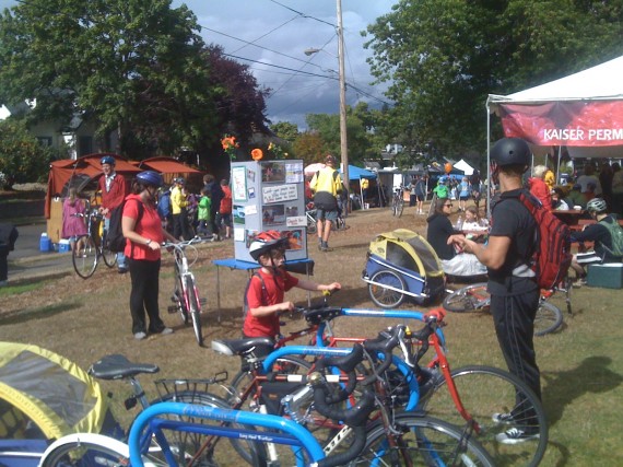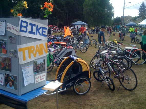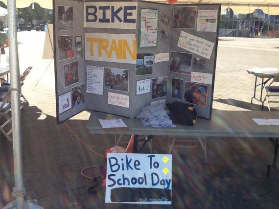 Last weekend I hit the road and talked to people at the Sunday Parkway and the 350 climate convergence that Laura, a bike train parent, helped organize. It was great to see how many people already knew what a bike train was and how many people had seen one roll by. A lot of time we just focus on how bike trains can help a school community get more connected to bicycling but I also think it was a positive impact on getting other people in the community to enjoy biking. My favorite moment was at the Sunday Parkway when a guy was excitingly telling his girlfriend all about what a bike train was. I didn’t even have to say a thing!